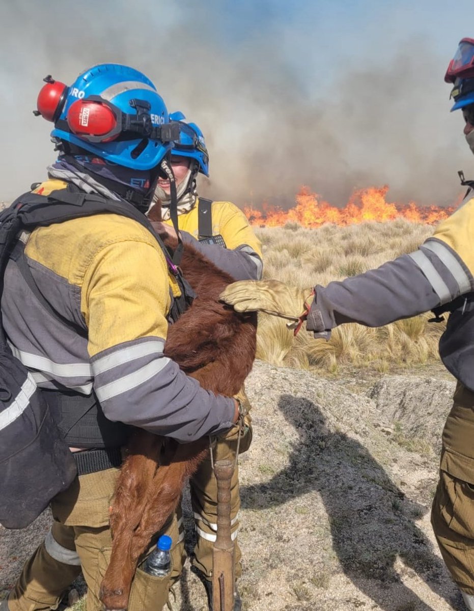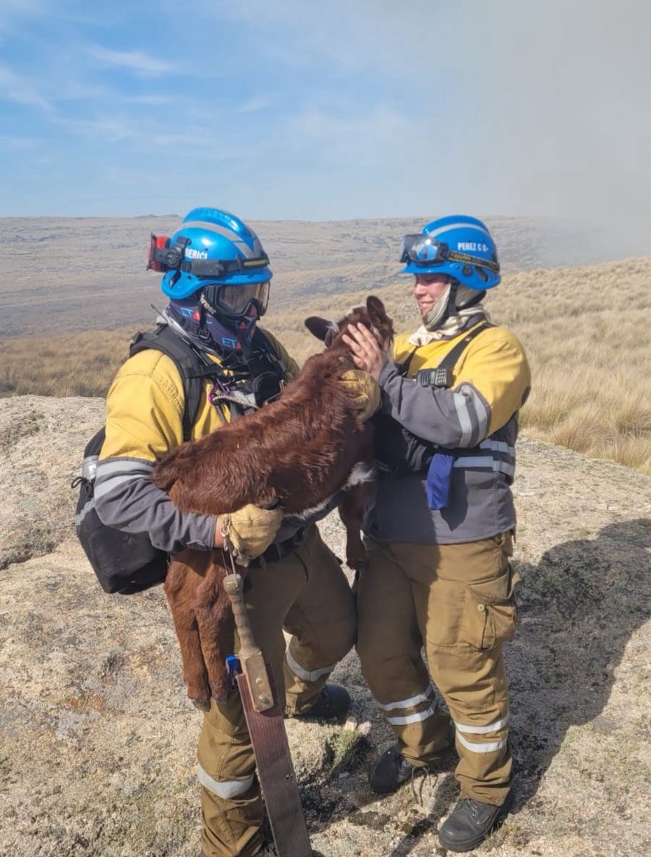 Agentes del ETAC rescataron a un ternero mientras combatían el incendio forestal en el Parque Nacional Quebrada del Condorito, Córdoba.